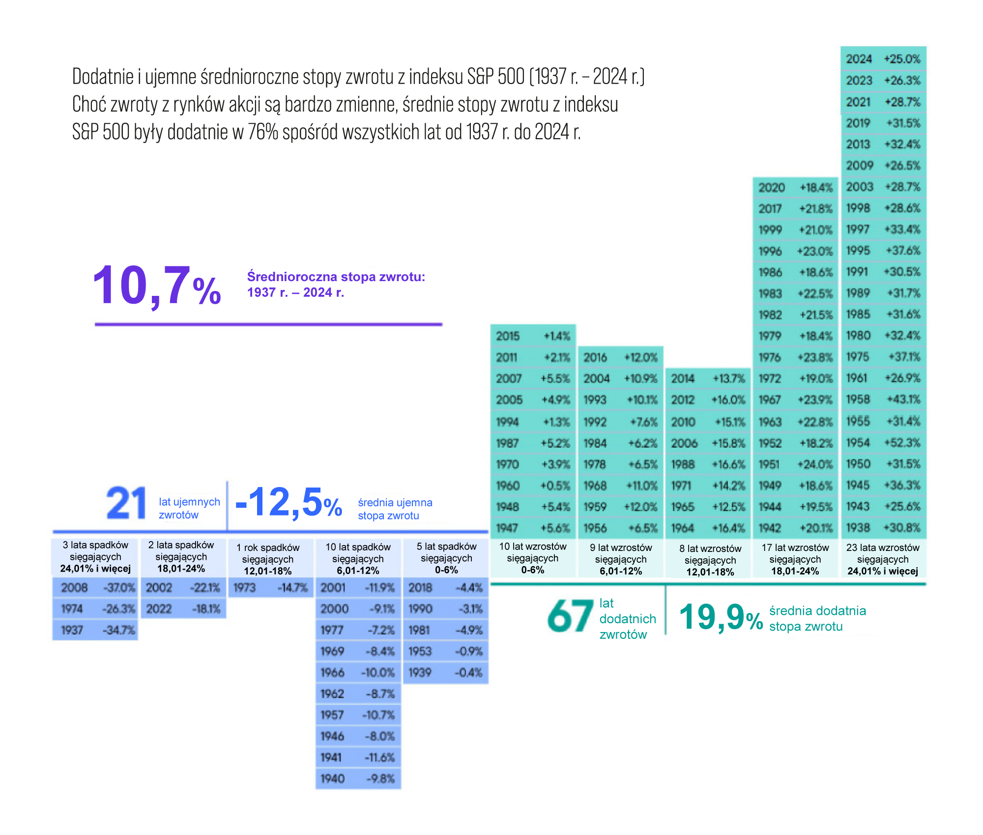 Trzymaj się planu i bądź zdyscyplinowany. Inwestowanie wymaga konsekwencji. Sir John Templeton mawiał: „Kupuj, gdy na ulicach leje się krew”. To może brzmieć brutalnie, ale w praktyce oznacza, by nie podążać za tłumem, lecz mieć własny plan i się go trzymać. Długoterminowo rynek nagradza cierpliwych. Jak pokazuje wykres, indeks S&P 500 kończy rok na plusie przez ponad 75% czasu. Wykorzystaj domowe zacisze do określenia swojej strategii inwestycyjnej i trzymaj się jej w momentach zawirowań. Emocjonalne reakcje na zmienność rynku zwykle prowadzą do złych decyzji.